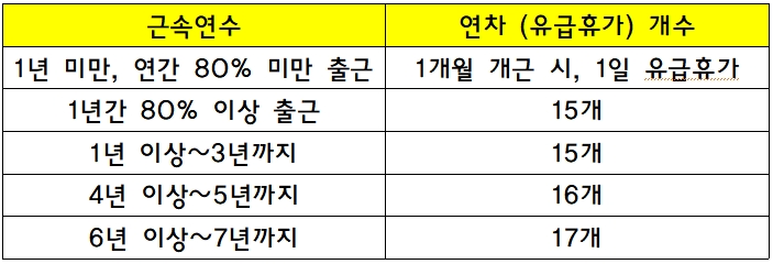 2022년 개정된 근로기준법 연차일수는 근속연수 기준으로 크게는 1년 미만 근로자, 1년 이상 근로자로 구분되고, 세부적으로는 1년 미만 근로자, 1년 이상 근로자, 3년 이상 근로자에 따라 발생하는 연차일수 및 시기가 달라집니다.