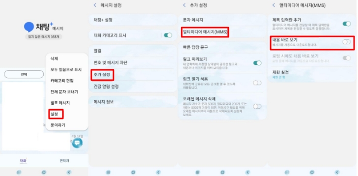 👉문자메시지→점 3개→설정→추가 설정→멀티미디어 메시지(MMS)→내용 바로보기 해제