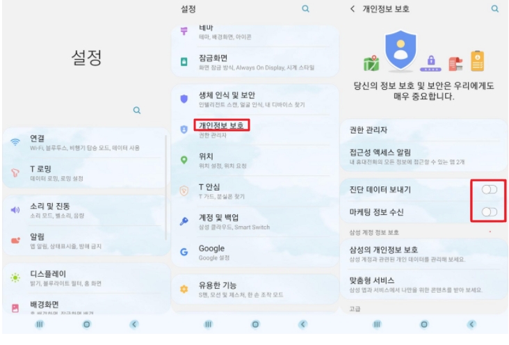 👉상단바 내려 '설정(톱니바퀴모양)'→개인정보보호(=생체인식 및 보안)→진단 데이터 보내기, 마케팅 정보 수신 끄기