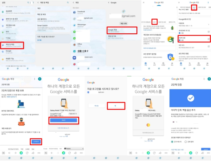 👉설정→계정 및 백업→계정→구글 계정→보안 탭→2단계 인증→시작하기→확인→보내기→지금 로그인을 시도하고 있나요?→'예'버튼→계속→휴대전화 인증 클릭